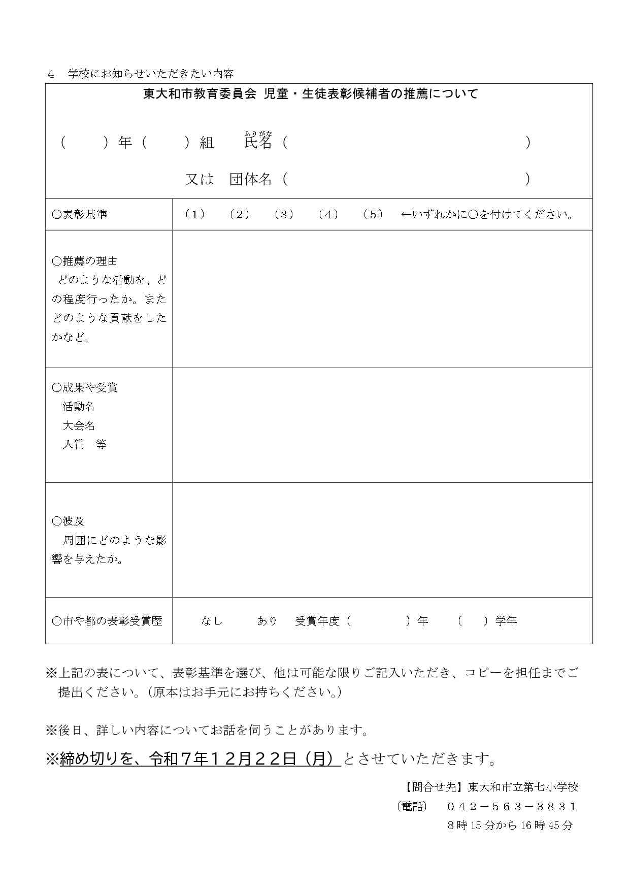 12/22まで「令和7年度 東大和市児童・生徒表彰候補者の推薦について」